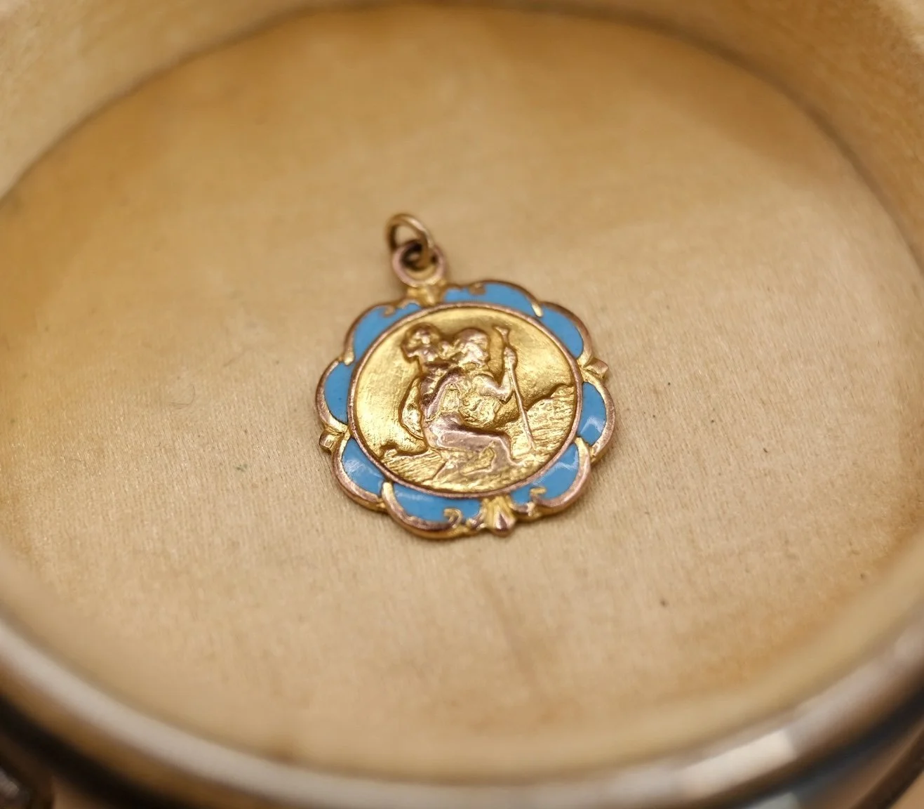 An excellent example of a St Christopher pendant with an ornate turquoise blue enamel border. A rare find! Hallmarked 9ct Birmingham 1924-1925 by TA (the A is a bit rubbed)